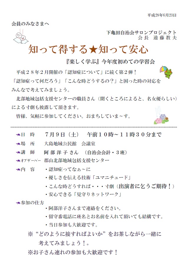 認知症に関する学習会を開催します。【下亀田自治会】